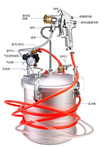 噴槍使用完成后需要將壓力罐與噴槍及時清洗,在不拆除情況下,應將清水倒入灌中,反復噴洗直至噴出全是清水,存放時應當拆卸氣管。